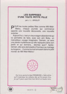 Les surprises d’une toute petite fille Home Bibliothèque Rose une toute petite fille Les surprises d’une toute petite fille © Librairie Hachette, 1963 pour le texte. © Hachette , 1988. Tous droits de traduction, de reproduction et d'adaptation réservés pour tout pays. Histoire Quelle sera la surprise d’aujourd’hui ? Pour Mili-Mali-Malou, chaque journée apporte une nouvelle découverte. Un vieux wagon abandonné … une plante mystérieuse … le mariage du forgeron … et voilà la fillette ravie. Il est tellement facile de s’amuser dans le petit monde de Mili-Mali-Malou ! POUR les toutes petites filles comme Mili-Mali-Malou, chaque journée qui commence apporte une nouvelle découverte, une nouvelle surprise. Aujourd’hui, c’est un vieux wagon abandonné qui lui permettra de faire, avec son ami Boby, un merveilleux voyage imaginaire. Demain, ce sera une plante mystérieuse qu’elle repiquera dans son jardin et qui donnera … devinez quoi? Après-demain, elle sera demoiselle d’honneur au mariage du forgeron … Comme tout est amusant dans le petit monde de Mili-Mali-Malou! Infos Type de livre : Mini-roseAuteur : Joyce L. BrisleySérie : Une toute petite fille P'tite infos Ce livre a 94 pages et porte le N° 489. Les P'tites listes des Bibliothèque RoseType de livre , Série , Auteur. 2 ième couverture pour ce titre, Couverture cartonnée publié en 1980 de 123 pages 15 juin 2025 ← Article précédent Article suivant → 0 0 votes Article Rating S’abonner Notification pour nouveaux commentaires de suivi nouvelles réponses à mes commentaires Label {} [+] Nom* E-mail* Site web Label {} [+] Nom* E-mail* Site web 0 Commentaires Commentaires en ligne Afficher tous les commentaires