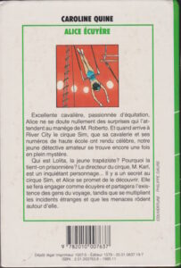 Alice écuyère Home Bibliothèque Verte Alice Alice écuyère © Hachette , 1990. Tous droits de traduction, de reproduction et d'adaptation réservés pour tout pays. Histoire Excellente cavalière, passionnée d’équitation, Alice ne se doute nullement des surprises qui l’attendent au manège de M. Roberto. Et quand arrive à River City le cirque Sim, que sa cavalerie et ses numéros de haute école ont rendu célèbre, notre jeune détective amateur se trouve encore une fois en plein mystère. Qui est Lolita, la jeune trapéziste ? Pourquoi la religion prisonnière ? Le directeur du cirque, M. Karl, est un inquiétant personnage… Il y a un secret au cirque Sim, et Alice se promet de le découvrir. Elle se fera engager comme écuyère et partagera l’existence des gens du voyage, tandis que se multiplient les incidents étranges et que les menaces rôdent autour d’elle. Alice écuyère ? Étonnant ! On la croyait détective, et la voilà engagée dans un cirque. Un cirque, oui… mais un cirque bien inquiétant, où d’étranges incidents se multiplient et menacent les artistes. Pourquoi Lolita, la jeune trapéziste, est-elle si triste ? Et M. Karl, le directeur, si agressif ?… Auraient ilsquelque chose à cacher ? Comptons sur l’écuyère-détective pour répondre à ces questions ! Et ces nouvelles aventures d’Alice seront les plus dramatiques, les plus imprévues, les plus périlleuses peut-être que la jeune fille ait jamais rencontrées. Infos Auteur : Caroline QuineSérie : Alice P'tite infos Ce livre a 218 pages et porte le N° 474. Les P'tites listes des Bibliothèque VerteType de livre , Série , Auteur. 2 ième couverture pour ce titre, Autre version souple de 218 pages publié en 1990 3 ième couverture pour ce titre, Version cartonnée de 251 pages, parution de 1977 4 ième couverture pour ce titre, Couverture cartonnée de 1962 de 251 pages numéroté 120 5 ième couverture pour ce titre, Couverture cartonnée avec la tranche rayé de 1985 de 186 pages 23 avril 2018 ← Article précédent Article suivant → 0 0 votes Article Rating S’abonner Notification pour nouveaux commentaires de suivi nouvelles réponses à mes commentaires Label {} [+] Nom* E-mail* Site web Label {} [+] Nom* E-mail* Site web 0 Commentaires Commentaires en ligne Afficher tous les commentaires