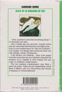 Alice et le dragon de feu Home Bibliothèque Verte Alice Alice et le dragon de feu © Grosset & Dunlap, Inc., 1961. © Hachette , 1964. Tous droits de traduction, de reproduction et d'adaptation réservés pour tout pays. Histoire «ALICE, voudrais-tu venir avec moi a Hong-Kong? » lui demande son père. Alice n’hésite pas une seconde, d’autant moins que son camarade Ned Nickerson est déjà là-bas … et qu’il y a du mystère dans l’air. Rien ne lui fait peur : ni le voyage, ni le danger des recherches dans une ville étrange, semée d’embuches. C’est devenu une habitude : Alice s’est acquis une telle renommée par son habileté à résoudre les énigmes qu’on l’appelle à l’aide chaque fois que surgit un problème embarrassant. Plus les mystères s’épaississent, plus Alice y prend de plaisir. Aidée de ses inséparables amies Bess et Marion, elle vit a Hong-Kong des heures d’angoisse et d’émerveillement. Infos Type de livre : Grosse couvertureAuteur : Caroline QuineSérie : Alice P'tite infos Ce livre a 187 pages et porte le N° 430. Les P'tites listes des Bibliothèque VerteType de livre , Série , Auteur. 2 ième couverture pour ce titre, Couverture cartonnée avec la tranche rayé de 1970 de 187 pages 3 ième couverture pour ce titre, Couverture cartonnée avec la tranche rayé de 1970 de 187 pages 23 avril 2018 ← Article précédent Article suivant → 0 0 votes Article Rating S’abonner Notification pour nouveaux commentaires de suivi nouvelles réponses à mes commentaires Label {} [+] Nom* E-mail* Site web Label {} [+] Nom* E-mail* Site web 0 Commentaires Commentaires en ligne Afficher tous les commentaires