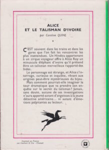 Alice et le talisman d’ivoire Home Bibliothèque Verte Alice Alice et le talisman d’ivoire © Grosset & Dunlap, Inc., 1936. © Hachette , 1961. Tous droits de traduction, de reproduction et d'adaptation réservés pour tout pays. Histoire C’EST souvent dans les trains et dans les gares que l’on fait les rencontres les plus inattendues. Un Hindou appartenant à un cirque voyageur offre à Alice Roy un minuscule éléphant d’ivoire qu’il prétend être un talisman merveilleux rapporté des Indes. Le personnage est étrange, et Alice s’interroge, curieuse et inquiète, rêvant aux origines peut-être mystérieuses du bijou. Mais comment pourrait-elle imaginer le tour dramatique que va prendre son enquête sur le secret du talisman? Jamais, sans doute, aucune de ses investigations n’aura apporté autant d’angoisses à la jeune détective américaine … ni autant d’émotions palpitantes au lecteur. Infos Type de livre : Grosse couvertureAuteur : Caroline QuineSérie : Alice P'tite infos Ce livre a 251 pages et n'a pas de numéro. Les P'tites listes des Bibliothèque VerteType de livre , Série , Auteur. 2 ième couverture pour ce titre, Version cartonnée numéroté 196 publié en 1965 de 251 pages 23 avril 2018 ← Article précédent Article suivant → 0 0 votes Article Rating S’abonner Notification pour nouveaux commentaires de suivi nouvelles réponses à mes commentaires Label {} [+] Nom* E-mail* Site web Label {} [+] Nom* E-mail* Site web 0 Commentaires Commentaires en ligne Afficher tous les commentaires