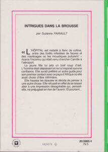 Fan de l'univers Humanitaire, suivait donc l'histoire captivante Intrigues dans la brousse , un livre édité en 1979 chez hachette dans la collection Bibliothèque Verte, il fait partie de la série " Jeunes filles en blanc " et il a été écrit par Suzanne Pairault .