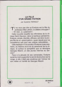 Suivait donc l'histoire passionnante la fille d’un grand patron , un livre édité en 1977, 1988 chez hachette dans la collection Bibliothèque Verte, il fait partie de la série " Jeunes filles en blanc " et il a été écrit par Suzanne Pairault .