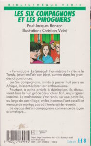 Les six compagnons et les piroguiers Home Bibliothèque Verte Les six compagnons Les six compagnons et les piroguiers © Hachette , 1978. Tous droits de traduction, de reproduction et d'adaptation réservés pour tout pays. Histoire « Enfin au Sénégal ! Formidable ! » s’écrie le Tondu, jetant en l’air son béret, comme dans les grandes circonstances.Les Six Compagnons, invités à passer huit jours en Afrique, laissent éclater leur joie.Cette fois, c’est loin de leur Lyon natal que l’aventure va les cueillir : à peine arrivés à destination, ils découvrent un piroguier inanimé, agressé pour s’être rendu sur une petite île près de son village… L’Afrique sera chaude pour les Six Compagnons ! « FORMIDABLE! Le Sénégal! Formidable! »s’écrie le Tondu, jetant en l’air son béret, comme dans les grandes circonstances.Les Six Compagnons, invités à passer huit jours en Afrique, laissent éclater leur enthousiasme.Pourtant, à peine arrivés à destination, ils découvrent dans la nuit, gråce à leur chien Kafi, un piroguier inanimé. Le malheureux s’est rendu sur une petite ile, au large de son village, et des inconnus l’ont assailli et menacé de mort au cas où il tenterait de revenir.Le voyage des Six Compagnons commence de façon dramatique … Infos Auteur : Paul-Jacques BonzonSérie : Les six compagnons P'tite infos Ce livre a 156 pages et porte le N° 174. Les P'tites listes des Bibliothèque VerteType de livre , Série , Auteur. 2 ième couverture pour ce titre, Version Cartonnée de 1978 3 ième couverture pour ce titre, Couverture ancienne souple numéroté 174 publiée en 1989 de 156 pages 23 avril 2018 ← Article précédent Article suivant → 0 0 votes Article Rating S’abonner Notification pour nouveaux commentaires de suivi nouvelles réponses à mes commentaires Label {} [+] Nom* E-mail* Site web Label {} [+] Nom* E-mail* Site web 0 Commentaires Commentaires en ligne Afficher tous les commentaires